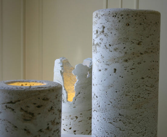 The vessels have been hand cast in concrete using white cement and a lightweight aggregate. After casting, characteristics of the individual vessels have been exploited, for example by invading weaknesses in the surfaces, piercing, wearing away, or exaggerating.