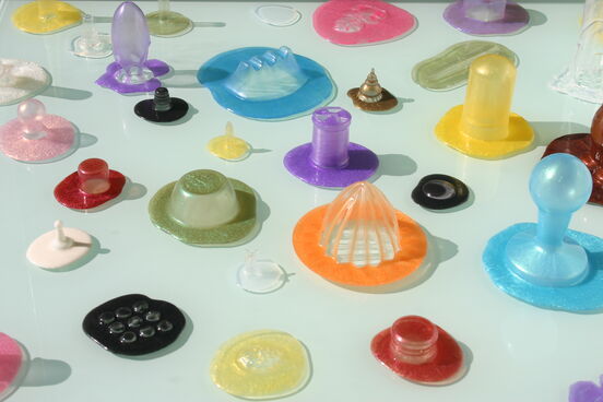 Bottle caps and condiment dispensers become integral components of Fitness' colourful world. She envisages the works displayed in this installation as forms evolving within a fantastical, slightly askew galaxy.