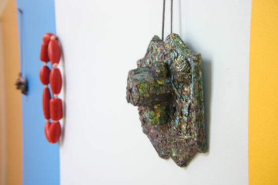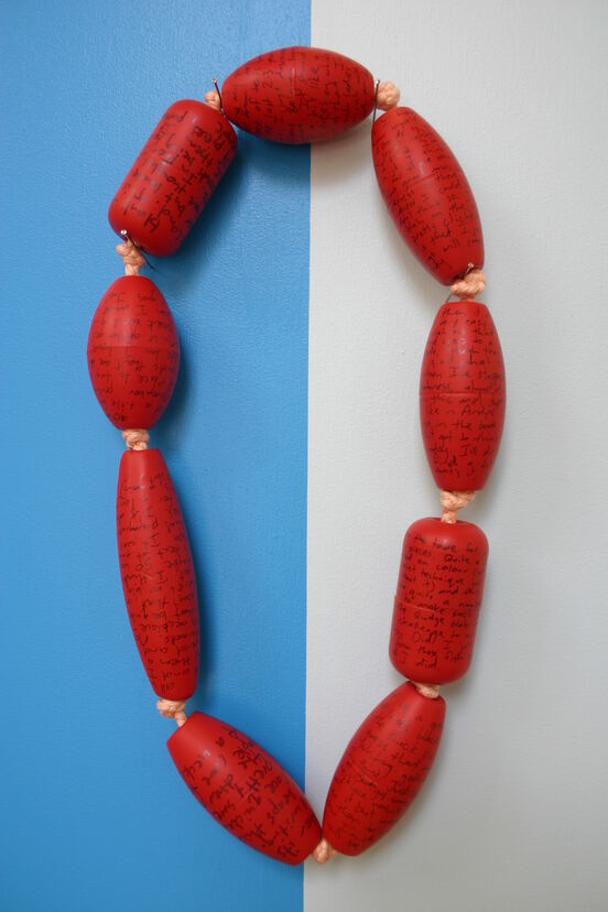This installation presents a selection of recent neck pieces by Lisa Walker, each of which utilises a range of materials from New Zealand collected by Walker when she returned home from Munich last December after 14 years abroad. The construction of the neck pieces resembles that of contemporary Polynesian lei, where the designs frequently draw upon found materials, both natural and manufactured, in bright colours and textures. Walker's works also refer to developments in contemporary international jewellery as well as to the 'Bone Stone Shell' jewellery movement that emerged in New Zealand in the 1980's. Damian Skinner has observed that Lisa Walker's ability to "play a game with both European and New Zealand jewellery makes her jewellery a joy to experience both at home and abroad."