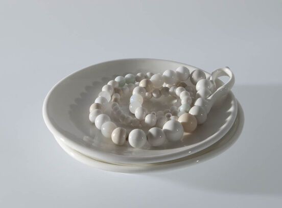 Manon van Kouswijk's installation Perles d' Artistes is also the name of an ongoing project focused on making a series of necklaces made on the basis of a strict method. The beads of no.1 necklace are made with two fingertips, no.2 with four fingertips, no.3 with six, no.4 with eight and no.5 with ten. First exhibited in 2009, the objects offer up to scrutiny little else than just that: a series of white (and then coloured) strung beads sporting a growing number of facets, arranged on the page (and in the gallery) as one would geometric models, from the simplest (a large lentil) to the more complex (an irregular decahedron). Benjamin Lignel in his essay The singular and the generic: portrait of the artist as a maker says, they flaunt the systematic, the serial, in the face of whatever notion of artistic spontaneity we hold dear. Each necklace implies a 'how to' that frames the way it looks, and spells out its position in a series. Not only do we know exactly what to expect, but the gesture of making a bead is already a classification, a standard of measure: that bead is this gesture.