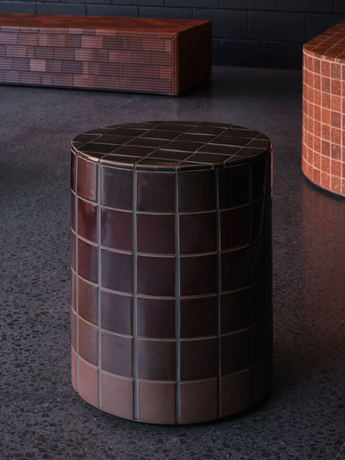 Mantle Overturn is an architecture of swatches. Each body of tiles – hand-made and clad to geometric plinths and platforms are intended to be used as seats and contemplated as objects.