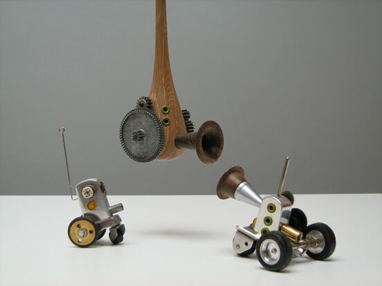 A window installation for Objectspace, Ben Pearce's metamorphic sculptural objects are painstakingly handmade and reminiscent of retro children's toys. Pearce suggests that these works are at once 'solemn and lost, yet in search of each other for cues and dialogue'.