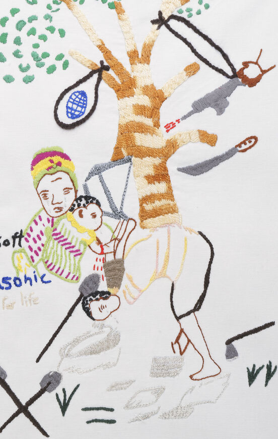 Although small in scale, Shamamba’s embroidered narratives are potent in their depiction of the ongoing conflicts in the Congo. Conflict over rich natural minerals is represented through metallic coloured forms whilst semi-figurative characters illustrate the daily threat of being killed or raped by militias holding rifles and, in some works, figures are shown attempting crossing the border. Within these graphic retellings, Shamamba also offers counter imagery such as the DRC flag that has been reconfigured as the ‘sun’ within her landscapes and act as symbols of hope that embody her resilient stance: “the beauty of Congo can light up the whole world.”