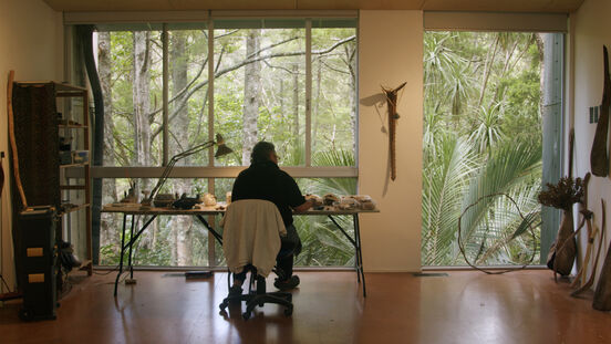 Neke Moa at Parehuia, still from video by Emily Parr, courtesy of McCahon House
