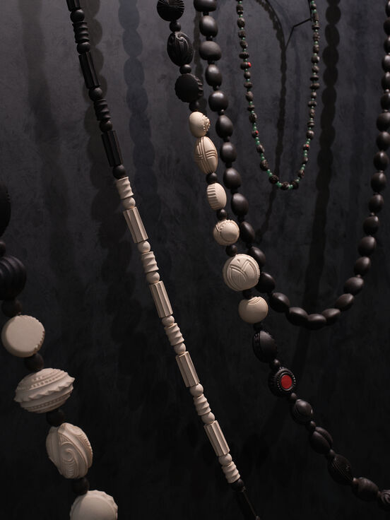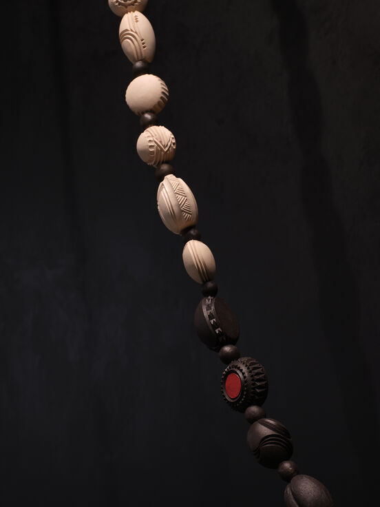 Houkāmau’s individual kākano (seeds) are handmade from uku (clay) and hand-carved, with patterns drawn from Aotearoa and further through the Pacific tracing ancestral routes back to Hawaiki. The unique shape and size of the individual seeds respond to the genealogy line to atua and tūpuna. When joined as a chain, they create a representation of the unbroken whakapapa links that stretch back and stay ever connected.