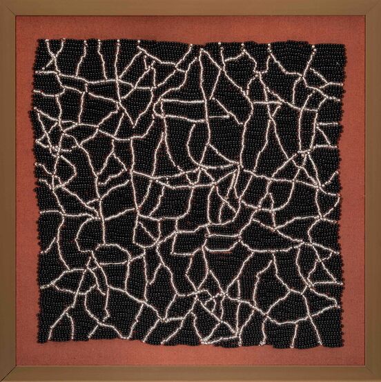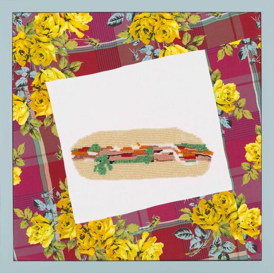 Abstract form and line borrowed from thrifted objects , architectural details, and urban spaces repeat throughout the installation building a pattern language which maintains throughout 'Opal Moon, Local Lime'. van Zon has a history of recreating the world she sees around her using traditional handcrafted methods such as tapestry, beadwork and ceramics. In this project she has also enlisted the help of various craftspeople for the fabrication of steel, leadlight and printed fabric pieces, allowing her the freedom to take on the role of auteur while maintaining her vision and signature in the work.