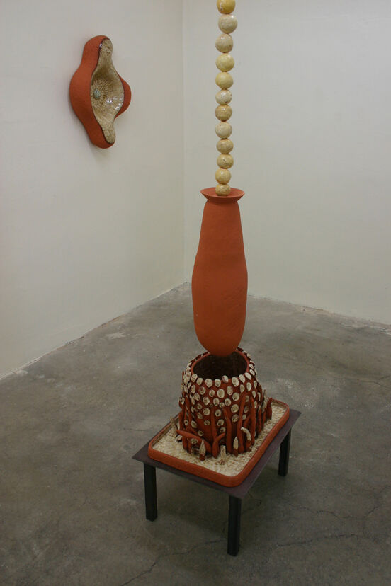 Extracting reproductive forms and other attributes from our foliage, in these new works the native forest of New Zealand and our engagement with it is investigated with fresh eyes. Chamberlin has created a terracotta landscape combining plant-like elements with subtle and erotic forms suggestive of the body.