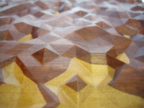 "These scans record the warp and weft grid of the weave in minute detail. By sampling small areas then enlarging and manipulating the surface heights an intentionally disruptive surface is produced. These surfaces are then outputted to a CNC cutter. By introducing inaccuracy in the layout of timber on the CNC bed and overlaying the cutting paths the resulting surfaces become unique. This uniqueness belies the accuracy with which they have been cut."