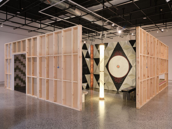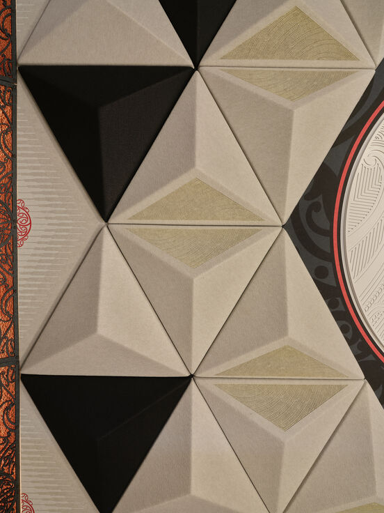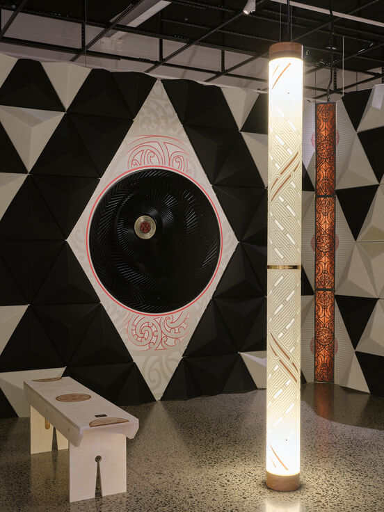 This year, in the second exhibition, we focus on areas where creative thinking is sparked, nurtured and deliberated. Four spaces conceptually important in te ao Māori – the marae, the kōhanga reo (learning nest), the kāinga (home), the whare taputapu (tool shed) – are interpreted and rendered as immersive environments. Situated within four rooms, the installations articulate the constraints that Māori design practice often sits within, and the boundaries that continue to be pushed and tested by discipline pioneers.