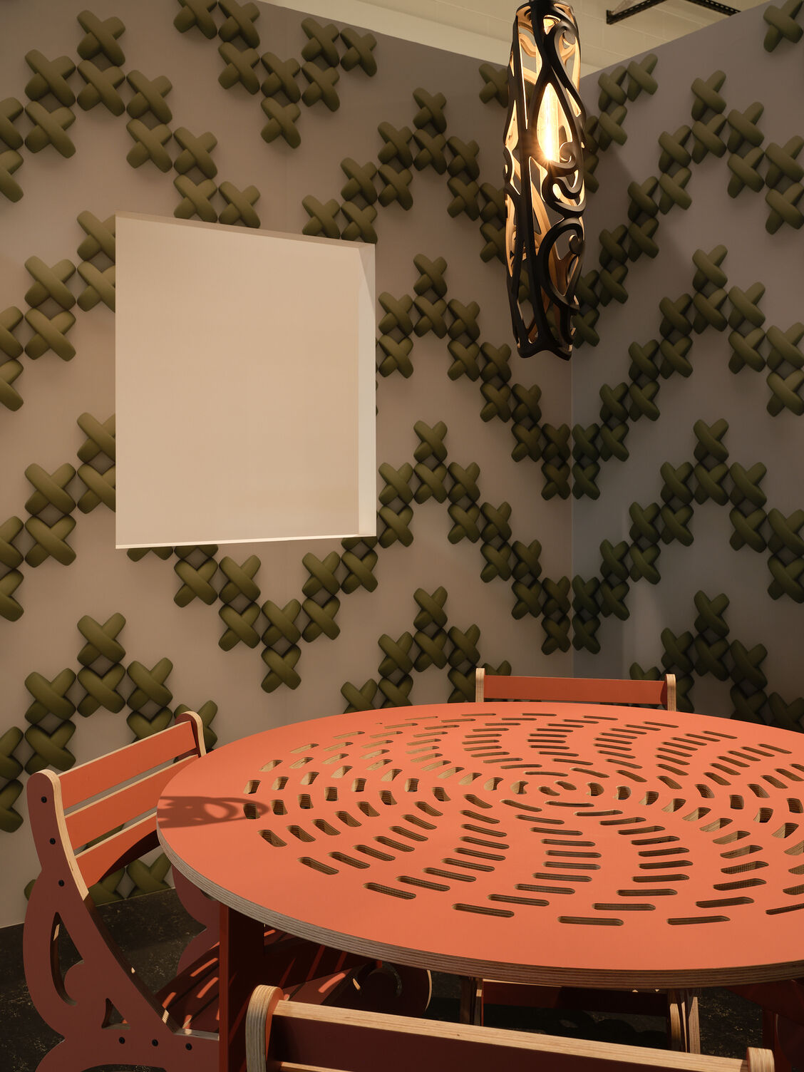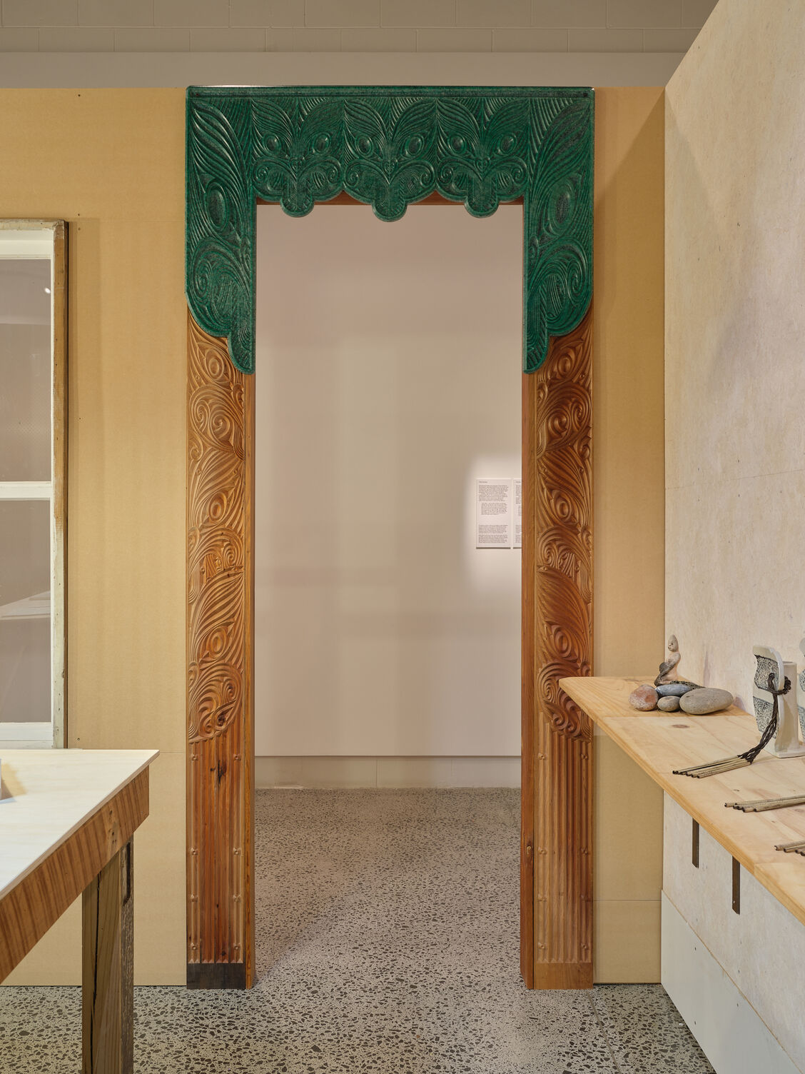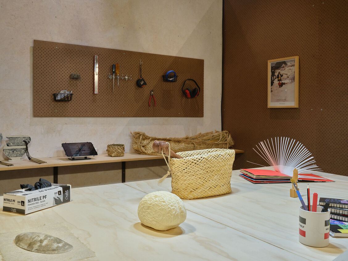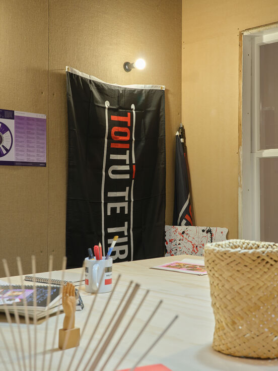 This year, in the second exhibition, we focus on areas where creative thinking is sparked, nurtured and deliberated. Four spaces conceptually important in te ao Māori – the marae, the kōhanga reo (learning nest), the kāinga (home), the whare taputapu (tool shed) – are interpreted and rendered as immersive environments. Situated within four rooms, the installations articulate the constraints that Māori design practice often sits within, and the boundaries that continue to be pushed and tested by discipline pioneers.