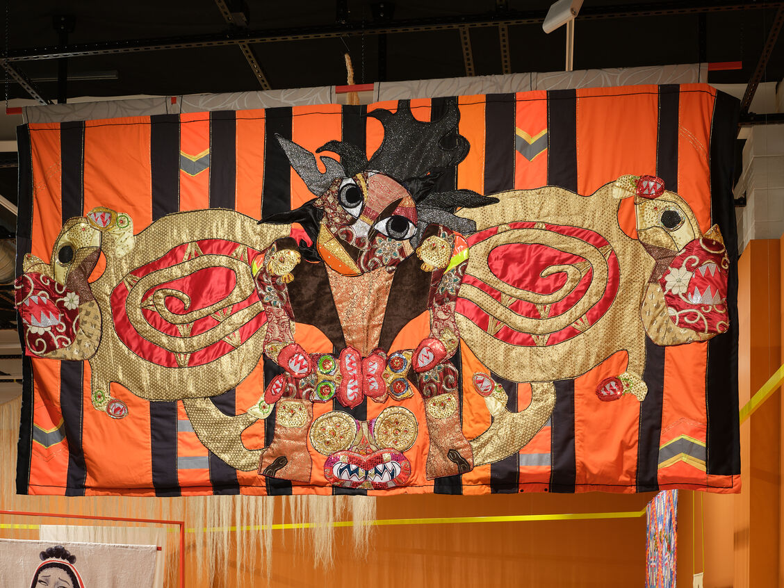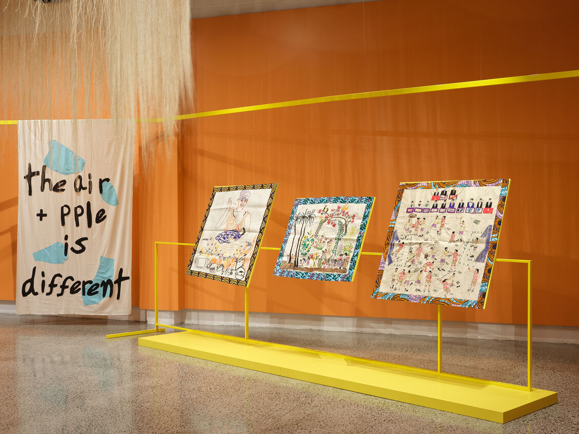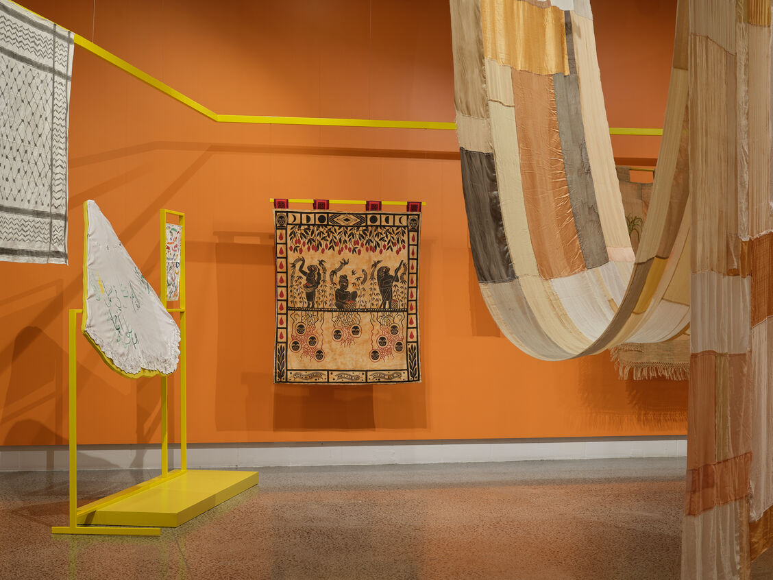 Installation view of PUPURITIA: Storytelling and Contemporary Textiles, curated by Melanie Tangaere Baldwin