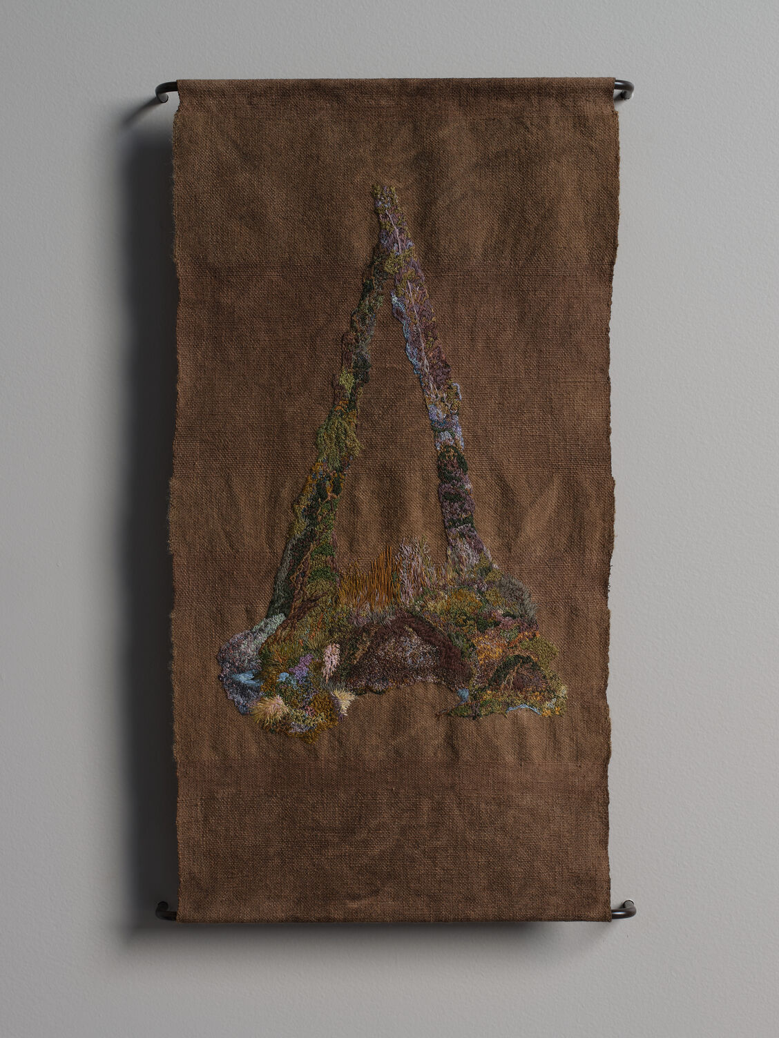 This new series of works continues Young’s expression of adoration of the whenua, māra and ngāhere through layered embroideries.