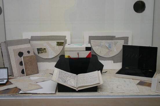 Although he principally worked in the medium of textiles Malcolm Harrison was also a great collector and occasionally produced assemblages of found objects, often as a gift for friends. The near cabinet features one such assemblage of found old and new works and small artworks. By themselves, and as part of assemblages, such objects were source material and inspiration for Harrison as a maker.