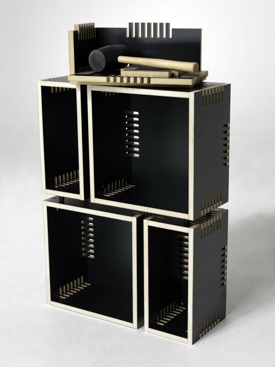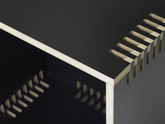 The exhibition at Objectspace presents two design outcomes by industrial designer Clark Bardsley and architect Andrew Mitchener, made using waste from commercial CNC cutting of MDF laminates. 'Isocle' is a decorative and acoustic wall tile system for commercial environments, each tile is created by splitting and sealing MDF shapes cut from waste areas of sheet. 'Herring' is a family of furniture that is easily assembled without glue or fixings. The size and spacing of the interlocking fingers that form the basis and identity of the collection are derived from the 3/8” cutting tool that is standard on all CNC cutting machines.