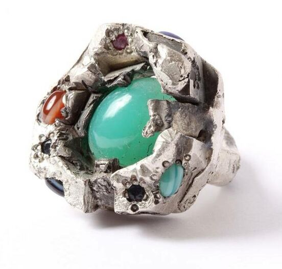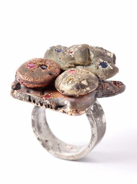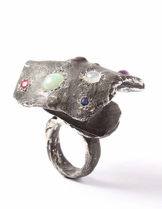 The pieces in Rings Without End have been oxidised, obscuring both silver and gold behind a coating of soot. An array of brightly coloured stones is set within this rough and rugged terrain. More of the ring is disclosed to its wearer as it is worn; the evolution of appearance a reflection of what the ring has experienced.