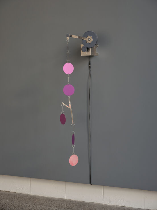 The works draw on two years of research into mobile display mechanisms, spurred on by Hadley’s interest in the ways movement is used in creative and commercial environments to capture interest. Like an air dancer in front of a car dealership or a maneki-neko (beckoning cat) waving at you from the counter as you pay, the gesticulation of Round Round is both playful and instructive. It’s wiggling to draw you in.