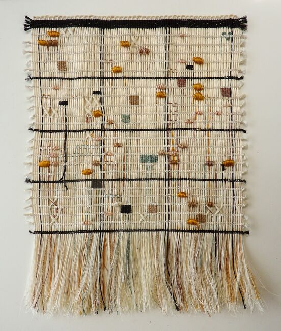 On loom hand-weaving is represented in this exhibition by garment makers such as the very experience Alison Francis, Burmese weaver Soh Meh Nga and emerging talent, Christopher Duncan. Homeware is given new value by maker Marta Buda while decorative accessories are the domain of Louisa Humphry and Rachel Long with her "livelihood" necklaces. Traditional off loom weaving practices commonly seen in the Pacific are also given a contemporary interpretation in raranga woven garments from Shona Tawhiao and baskets woven from recycled plastic by Molly Pihigia. Cloaks, shawls and wraps are found in all weaving traditions and are given modern iterations by Kohai Grace's whatu piece Tipu Rua, Premsagar Tyler crepe weave wrap and Patricia Bosshard-Browne’s checked shawl.
