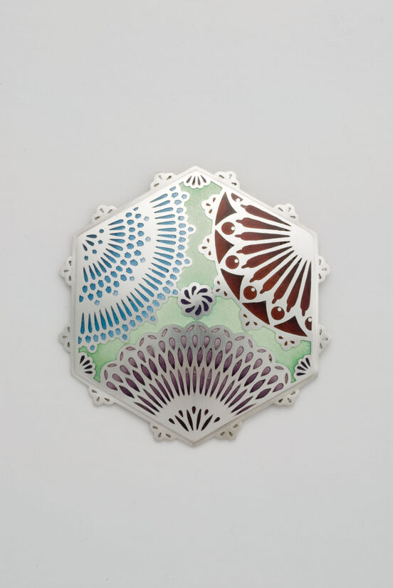 The enamel brooches and objects by Jasmine Watson in the exhibition Subsequence relate to her ongoing interest in pattern and symmetry. Watson states, "My work is inspired by ornamental patterns and complex detail based on mathematical principles. I am interested in geometry and tessellations; interlocking shapes that can assemble into elaborate ornamental sequences, repeating to infinity."