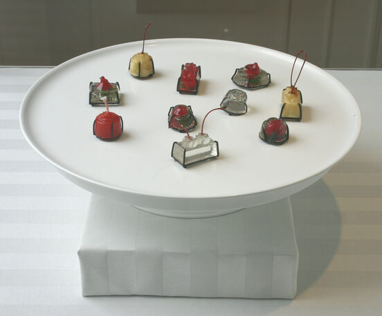 "This series is an exploration of desire and the myths that surround love, romance, and the gift. Here I explore the role of the gift as signifier of mythic promise. Often gifts symbolize hope or desire through the act of giving and receiving. This hope is that the qualities of these gifts or objects will come to symbolize or transpire on those they are for or that which they represent. The rose, embedded and preserved in its toxic resin bed, the empty resin chocolates, the nipple-like forms and the candle, all suggest the unattainable nature of myth; it is fake. Some preserve nothing, referring to Jacques Lacan's theories on desire; these objects have no substance, they can never fulfil, therefore are empty. The rose scented candle, referencing the short-lived nature of romance and the volatile nature of love, sits like a bomb awaiting ignition. Such objects only highlight our quest for satisfaction, embedding us in the myth and desire for romance and eternity."