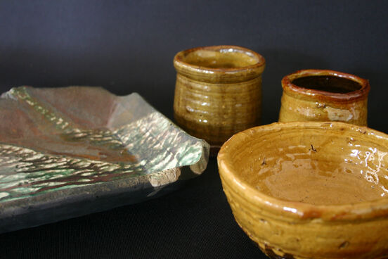 Drinking green tea has great significance in Japan. The tea equipage includes a cloth (chakin), tea bowl (chawan), caddy (temae), scoop (chashaku) and whisk (chasen). In Japan these objects are revered: some tea bowls hundreds of years old are still in use on special occasions. Whisks, which are easily damaged, are taken to temples and ritually burned in an annual ceremony. Dawson also respects the ritual quality of these objects and their quality as ceramics. For him the tea bowl is almost a test case ceramic. When asked what he thinks the hallmark of a good tea bowl is he says that it is the quality "of making you want to pick it up, examine it and then decide where to drink from".