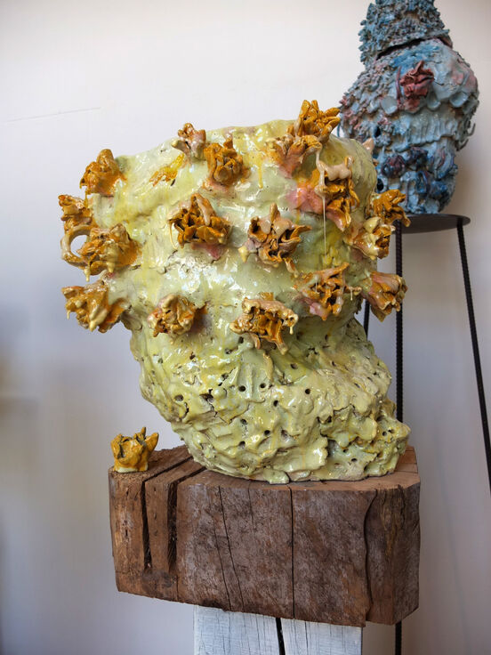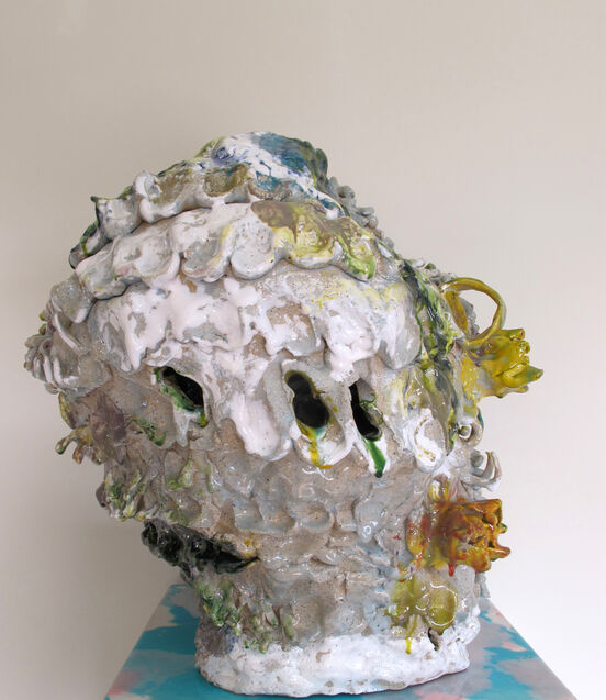 The most striking aspect of these works is the loose handling of form and colour. The textured surfaces have been pushed, gouged, pinched, and pulled in or out of shape. They have a gestural style of glazing that celebrates drips, cracks and globules and generates elements of 'randomness'. Resin has been used to create additional layers of controlled colour and texture.