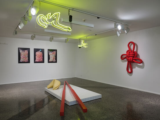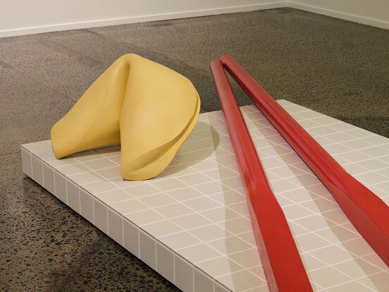 Here Greenbank assembles a collection of one-liners that playfully explore food as an expression of cultural identity. The work brings together highly recognisable symbols such as chopsticks, rendered larger than life, alongside neon signage and decorations reminiscent of restaurant interiors to consider the way migrant identities are presented and experienced through stereotypes related to food.