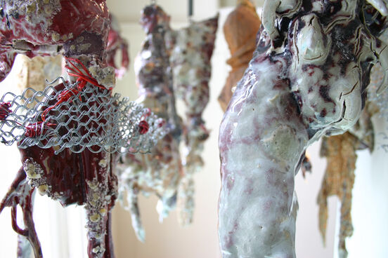 A window installation for Objectspace, The Inside Story is an exploration into formlessness by Dunedin based artist, Blue Black. Comprising a range of expressionistic and organic ceramic forms suspended from a modified wire bed frame, this installation represents the end product of a highly personal and physical making process.