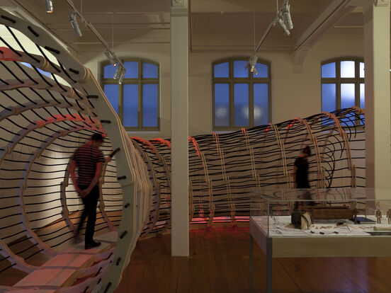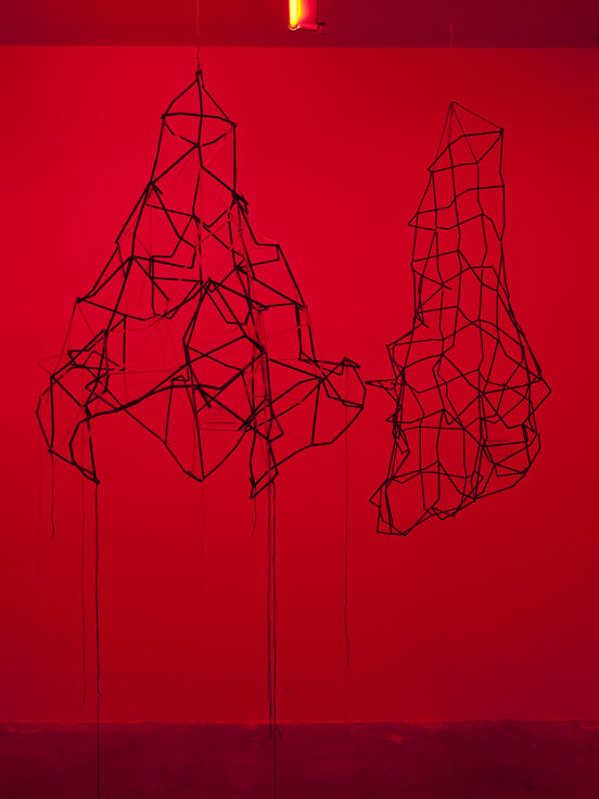 Exploring the notion of a talisman - an object believed to exercise protective power – the makers aim to investigate themes of containment, protection and restriction. Working together in an increased scale of form and outside the realms of their respective practices, was new to both makers and it has pushed them conceptually and technically. Comprising over 1,000 components, the open construction in the works is suggestive of basketry, skeletons, traps, and tunnels. The talismanic aspect of the structures is evident in terms of the repeated patterns and also with the use of the red hemp cord. In many cultures, the colour red is considered to hold special powers of protection and be able to attract good fortune.