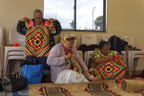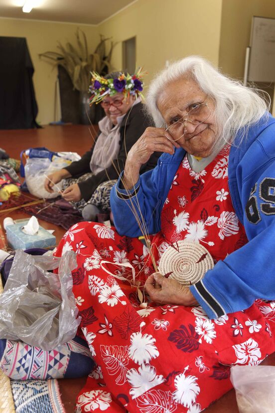 The group was formed in 2012 and currently numbers around 100 women, over a wide span of ages. Many of Fafine Niutao I Aotearoa’s members are based in Auckland; with a core group of elder members gathering every Thursday to make together, at the Pacifica Arts Centre, at Corban Estate Arts Centre in Henderson. As a group, the women practice a range of Tuvalu art-forms, including kolose (Tuvalu crochet), and the weaving of usable objects such as fans, baskets and trays.