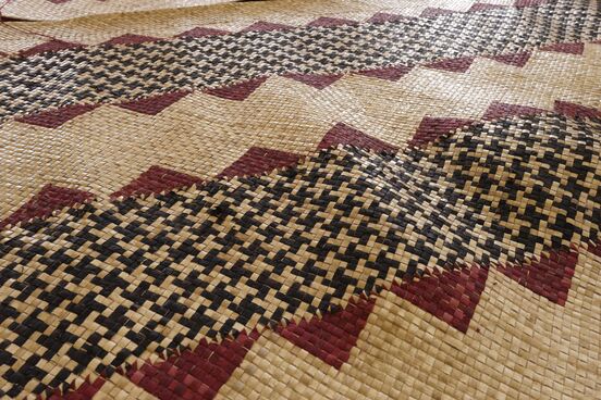 The collective are now working to continue the art-form, using the customary bark and roots to dye fibre prior to weaving. A red colour is created using the root of the nonu tree, while the bark of the togo tree is scraped to produce the black. To Weave Again demonstrates the Niutao approach to pandanus weaving – incorporating motifs of dyed fibre into the main body of weaving – with coloured, decorative elements seamlessly woven in as the entire mat progresses. On other atolls, it is common to complete a plain mat, before weaving coloured motifs into the finished article.