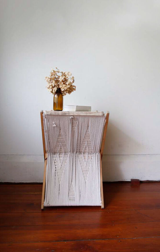 From bicycle tyres to ice-block sticks, Hannah tests her source materials using processes such as weaving, knotting and threading, utilising repetitive processes and patterns to create tactile and dynamic surfaces. Final works are a selection of furniture, wall panels and sculpture, and are a response to the physical properties and aesthetic qualities of the source materials, turning them from something discarded into something new and desirable.