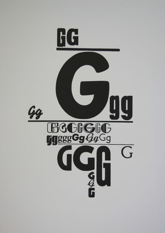 Restricting the specimens to 18 point and above, she began with A, working alphabetically through to Z. The resulting suite of prints, each capturing a single letter in various forms, offers a visual rather than a linear logic. Each letter, and subsequently each font, is removed from its taxonomic register - detached from its own internal logic. The suite, and individual prints, are unconcerned with dating, naming or contextualizing each font, but attempt to graphically present them as visual forms. Aside from the logic of having a specific letter of the alphabet on each print, each composition was dictated by the type - how the variety of forms and characteristics could fit together - piece by piece like a puzzle. Each print contains both differing and recurring typefaces, with the same fonts emerging at regular intervals. The result is a suite of type specimens from A to Z.