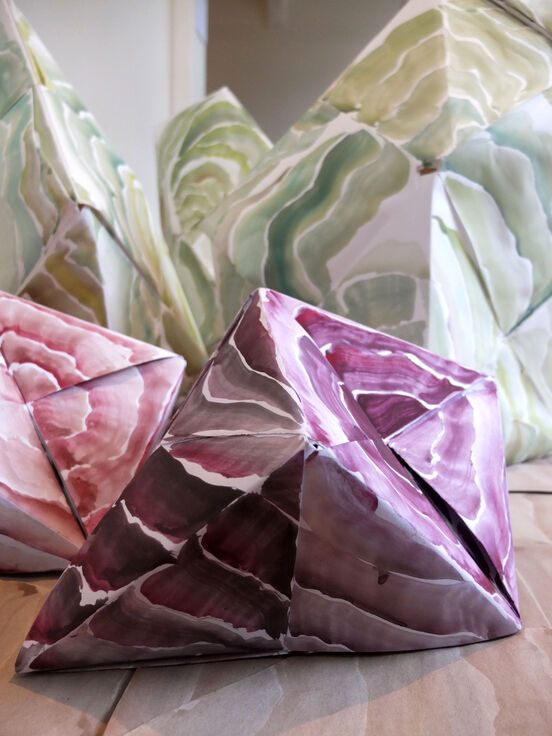 She says she enjoys "the lightness of paper and its approachability; it lends itself well to playing and painting." Her painted forms retain the fluid brushwork and freshness evident in her two-dimensional paintings. Nuanced in composition and rich in expression – the multi-faceted paper forms in this installation have an "aliveness" that is generated in part by the sense that there is more to be discovered through the "unfolding" of the objects.
