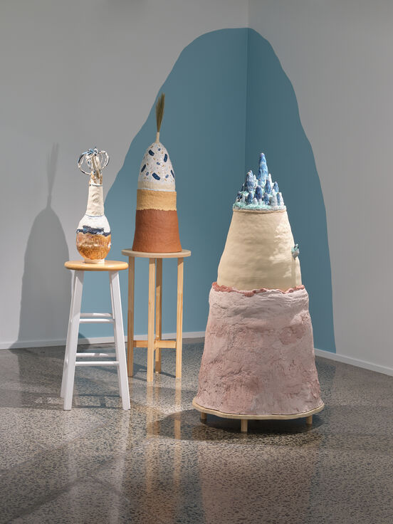 Becky Richards, Blue Bungle Kingpin, 2021–2022, Party Egg, 2020–2022 and Cosmic Pinecone, 2020–2022.