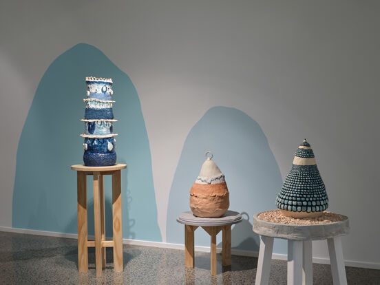Each work possesses a distinct personality. Familiar shapes are stylised and exaggerated, rendering the works cartoonish. They unfurl, stretch and puff out their chests; their bodies bear traces of fingers and palms — preserved conversations between maker and matter, emphasising the physical properties of clay.