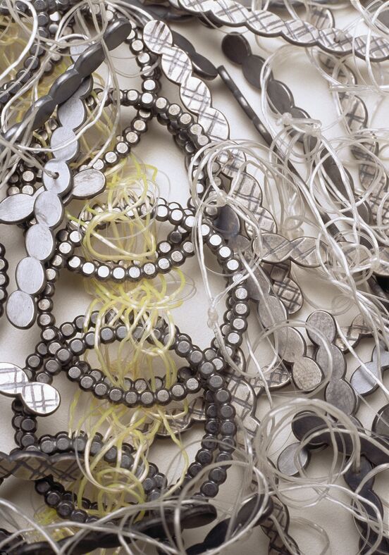 Cross describes her work as "Drawing and collage underpin my creative activity as a jeweller. I handle materials intuitively; this fuels the development of ideas, often in direct response to the making process. Gold and silver, usually in the form of wire, provide the basic dialogue, whilst combining and contrasting textile related materials offers a greater freedom of expression and spontaneity. Silver is oxidised black, likening it to the drawn graphite or inky line. Linear structure, texture and transparency are all qualities with which I am fascinated."