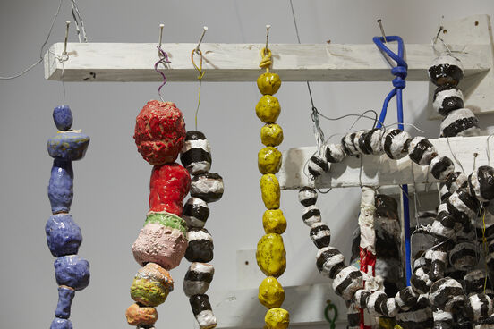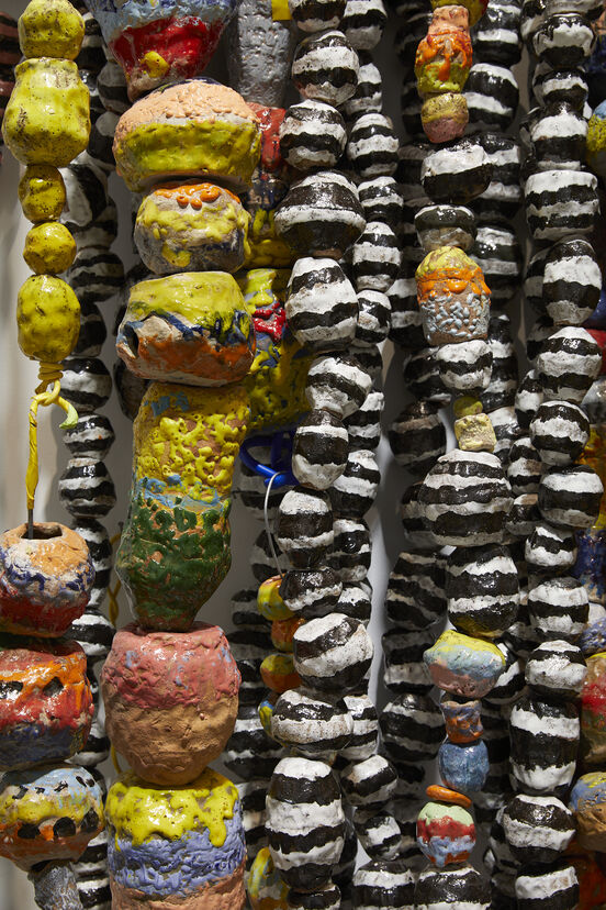 The more the merrier might well be the mantra of Cooper’s obsessive mode of production. In his studio a cortège of a dozen ‘anything’ is always better doubled. His strings of beads might be readily understood as signifying the beads of sweat that accompany labour. The physical grunt of their repetitive making signals an abrasive approach to any notion of ‘mastery’. Bombastic rather than nuanced, these pearls are ‘oafish’ not cultured. Cooper’s Godzilla-scale rosaries are abject trophies, a parody of the impoverished ‘big is better’ corporate bauble.