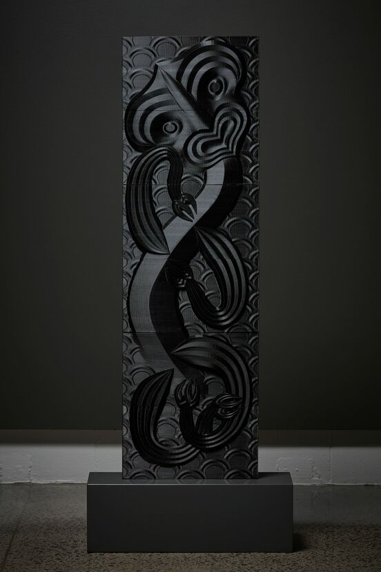 Nearby in the gallery, a stack of 3D printers took centre stage. The stack referenced Tāne both in vertical form and in the poupou they busily printed over the duration of the exhibition, transforming the space into a studio of sorts. Working simultaneously, they built portions of four poupou in the tuare style of Te Āti Awa carving, which, once finished, were assembled to reveal different personifications of Tāne. The continuous printing meant Taepa's process was actively present in the gallery, deepening the audience's understanding of the technology and how it was employed. Rather than presenting them as a replacement for carving, Taepa used the 3D-printed poupou to speak of what could be done with the machines, a whakapī way of working that could exist in parallel to the whakairo of wood and chisel.