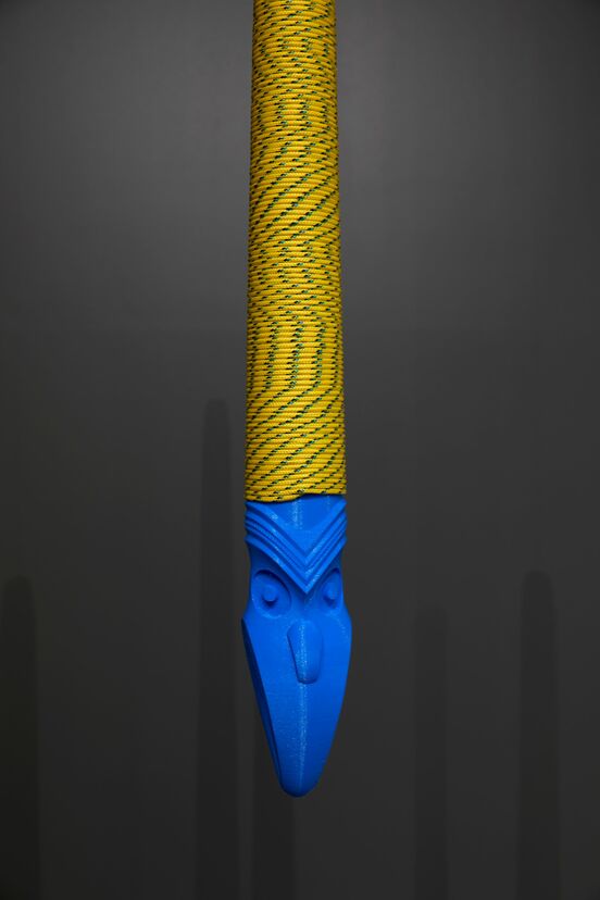 Five pūkāea (trumpet-like taonga pūoro), 3D-printed in bright primary colours, were suspended at the entrance of the gallery space and created a symbolic opening, an invitation to cross the cultural and spiritual threshold. Pūkāea were traditionally used for signalling in times of conflict and in ceremonial rituals during peacetime. Rather than being a decorative representation, Taepa's instruments are functional, able to be played by masters of taonga pūoro. In this way they bear out Taepa's multiple intentions for 'Transmission', in which the series of works oscillates between honouring atua and tūpuna, exploring materiality and considering the way physical and digital realms can connect and extend one another.