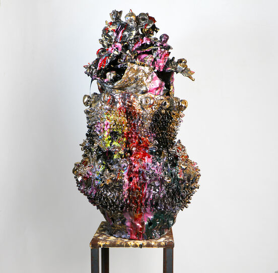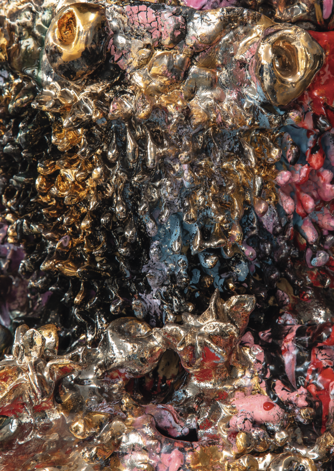 A self-described outlier, Leonard is one of only a handful of artists in New Zealand working exclusively in clay who occupies this space. As with Barkley’s, her vessels (and they are vessels) bear traces of lids, handles, footings and ornate decorative detailing that speak to pottery — reconfigured, however, in vivid sculptural forms. She abandons other references and modes (utility, technical perfectionism, domestic scale) that do not serve her purpose. The outcome is audacious and scintillating, with a sensory impact so materially expressive that it achieves an unlikely union, at once celebrating clay and drilling into its craft tradition, while remaining ambivalent to satisfying its usual requirements.