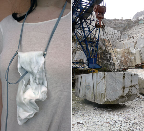 CP: The necklaces are part of the second chapter in our collaboration, Façades (2011). The project started with a first visit to a marble quarry in Carrara, Italy: we were blown away by the sight of the mountain, consumed as it was by a relentless extractive activity that has been going on for at least the past 2000 years. It was unsettling to see how the natural landscape has been levelled down – by human forces just as much as, or perhaps even more so than, natural forces – to satisfy our artistic or productive needs throughout the centuries. After our visit, we were wondering if that sense of anthropogenic sublime could be encapsulated in the scale of jewellery.
