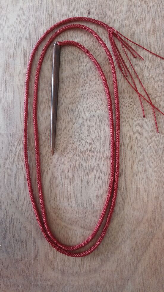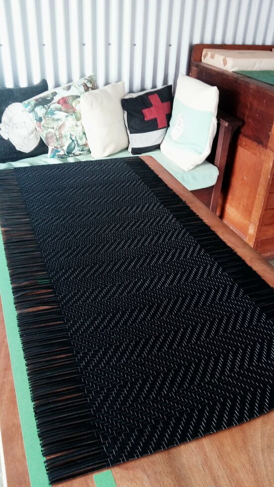 In one of my photos is the first completed section of a kahu raranga konunu (black woven cloak); based on a kahu raranga puputu, thought to be the oldest styled Māori rain cape in existence. It is plaited in the same way as a whāriki (floor mat), and the main pattern of the weave across the surface is torua whakatakoto, a horizontal twill pattern that passes over and under two strips at a time. My interpretation will be constructed in two panels displaying a whati raranga and will have three decorative fringes top, middle and bottom.