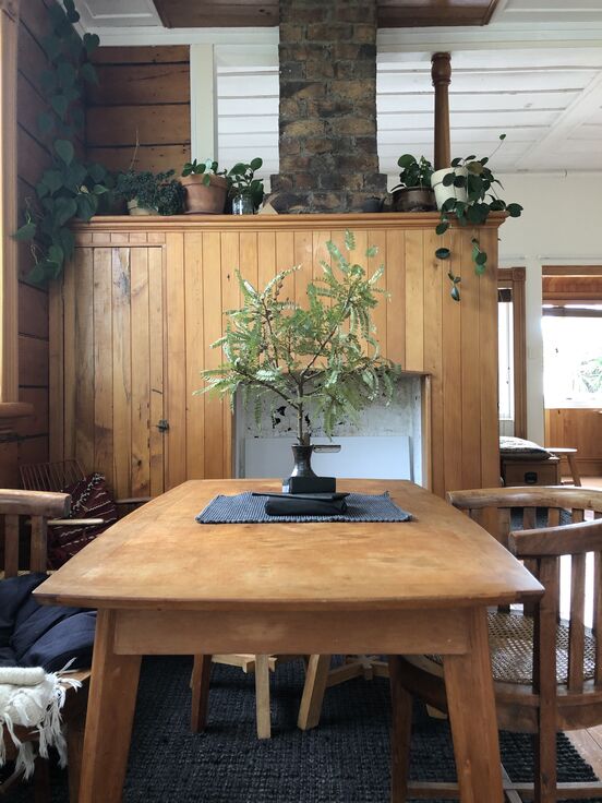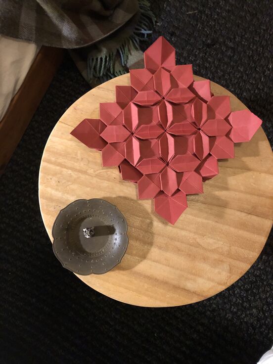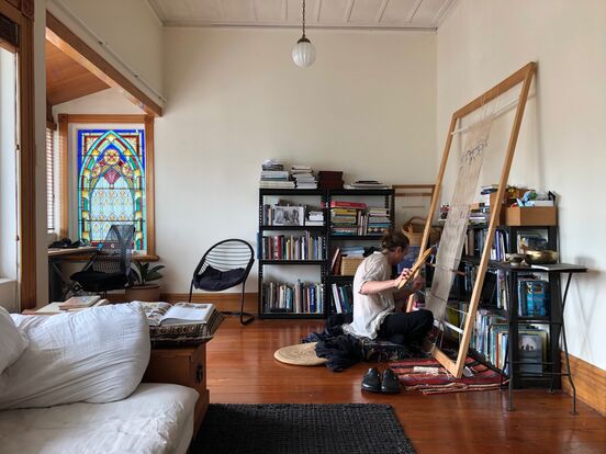 A month or so before the lockdown I relocated from the countryside, north of Auckland back to the city. I moved into an old worker’s cottage with my friend Elle, her son Otto and Anu the cat. The dangers of our old gas cooktop were offset by the claw foot bath, front and back gardens and the open fireplace. Amidst the adjustment of lockdown home life I installed a vertical loom in the lounge. Made of a canvas stretcher frame, dowels and heavy duty plastic-type rope it is hard to miss, but fits its purpose. For four weeks I wove black linen through the cotton rug warp in a soumak technique, Otto attended virtual high school and folded paper into floral tessellations, Elle wrote words on artists, planned the garden and documented our isolation. Evenings were spent cooking, playing cards and watching the phases of the moon. As the lockdown eased I’ve been able to access my studio where the large floor loom has taken root.