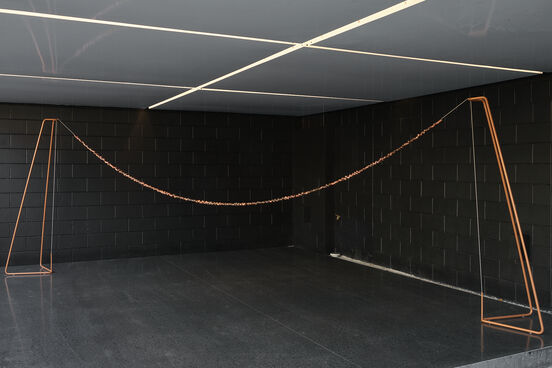 More than 500 copper rings span the dark brick and concrete courtyard. Suspended in a relaxed curve from eye to waist height they invite intimate inspection. The changeable coastal climate of Tāmaki Makaurau transforms salmon pink copper to rich earth brown, grey and black. Green oxides the colour of new fern fronds appear, fingerprints from the many ring makers and visitors to the gallery develop like photographs over the course of the year-long installation.