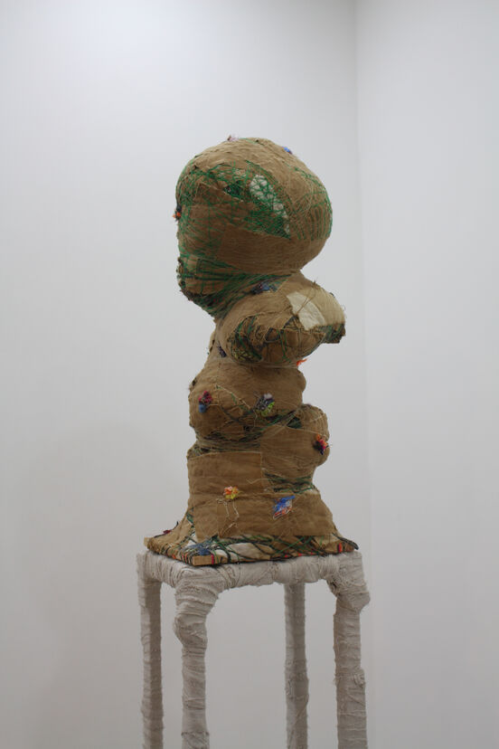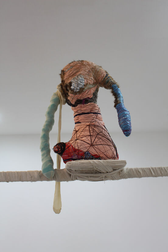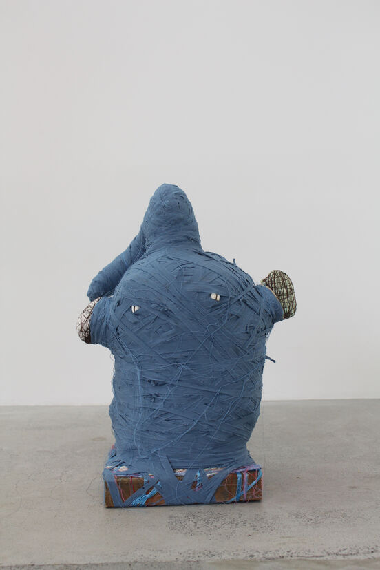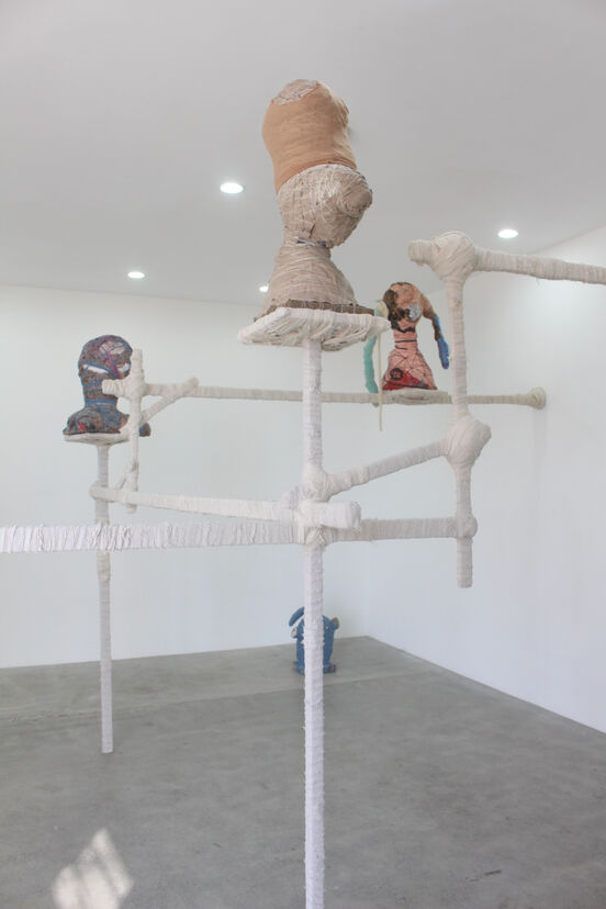 Te Waa’s forms imply preservation and celebration of the body. The sculptures use the language of ancient Greek and Roman marble busts—laden with hierarchy and opulence. The context is refashioned as the heads and torsos are sculpted with fabric. The result is a material-induced delirium. When the hoardings from the artist’s vaults are sculpted into something lifelike, they celebrate and familiarise us with human bulges, skin and tufts of hair. Some of the works wear single-colour ensembles to organise the haul, others are more exposed; flesh and fuchsia pinks, caramel and dark browns are to be found in the corporeal cacophonies. Their tacit bones are similar in scale to our own; in this way, they offer up empathy. Each piece invites further inspection as its anatomy slips from plane to plane, contorting and sometimes changing; the sockets of shoulders morph into strange ears in My Little Darling (Figure 1) and exposed fabric over the ‘heart’ could also be a bizarre mouth in Grateful Man (Figure 2). The material threads and strips that swaddle the forms and frames recollect practices of mummification, medicine and adornment. These ritualistic coverings bind each piece and celebrate the volume and contour of the body; wrapping lines pinch in at the joints, letting bulging limbs protrude elsewhere. In Te Waa’s intricate installations—such as in his solo show Clingwrap at Sanc Gallery (Figure 3)—each work sits in a connected system, on a plinth or scaffold bound in fabric. They seem to writhe under their wrappings; they look playful, as if they are wriggling with excitement to tell the stories that have been woven together. Busts are revered forms, but having been animated with cheap and cheery threads, they declare themselves capable of pleasure as well as spiritual potency.