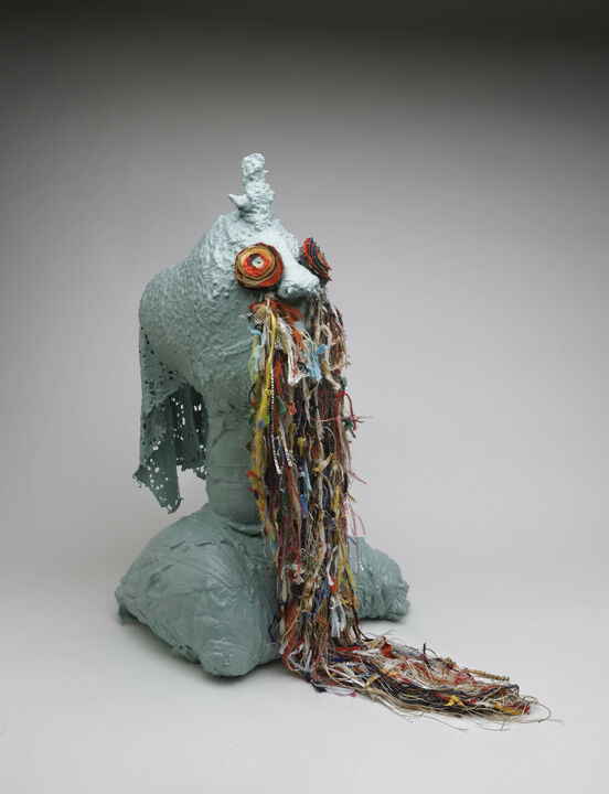 The psychic force behind the works is propelled by a collector's disposition and embedded in mātauranga Māori. Whakapapa⁴, the core of mātauranga, connects all animate and inanimate, known and unknown phenomena in natural and spiritual worlds. Creation genealogies are central to this; through whakapapa, life’s early ancestry can be followed through mythological heroes to gods and then Mother Earth (Marsden, 2003). Whakapapa reflects this reality of life being woven together, weaving and clarifying cultural knowledge from one generation to the next. Te Waa weaves knowledge through the titles of his works, interjecting connection and meaning by referencing his lineage. In some of his recent sculptures, the titles come from the writings of the artist's ancestors. The bodily sculptures are thus connected to a deeper familial unit, rather than being new creations in isolation. Charles Royal (2017) discusses the creative potential of utilising mātauranga Māori to make sense of the modern world. He observes that cross-disciplinary “knowledge weaving” (p. 14) is essential to Indigenous knowledge, and that weaving across boundaries cannot take place without the boundaries themselves existing. He claims the natural borders in knowledge have a purpose, that the holistic view of the world and knowledge considers parts, boundaries and borders both as wholes in themselves and as parts of larger wholes. “Life is a complex and multidimensional whole and the quest to see the ‘whole’ is to render disciplines as part of a complex set of pathways leading to wholeness rather [than] fragmentation” (p. 15). In place of hierarchical and individualised Western knowledge, weaving of mātauranga Māori looks at how to understand the modern world in terms of wholes. Tyrone Te Waa’s approach unlocks this creative potential, embracing the divisions and connections between materials, the body and whakapapa. Te Waa is engaged in a variety of creative practices. He uses their overlapping teachings, the works have both a pictorial and craft sensibility. The sculptures, paintings and drawings are all filled with insistently nuanced working; the expressive silhouettes, singing colours and built surfaces can be seen in each artistic mode. There is evidence of blurring between his objects, images and installations. The sculptures are a recent parameter for these ideas, loaded with brilliant lowbrow and unexpected fabric.