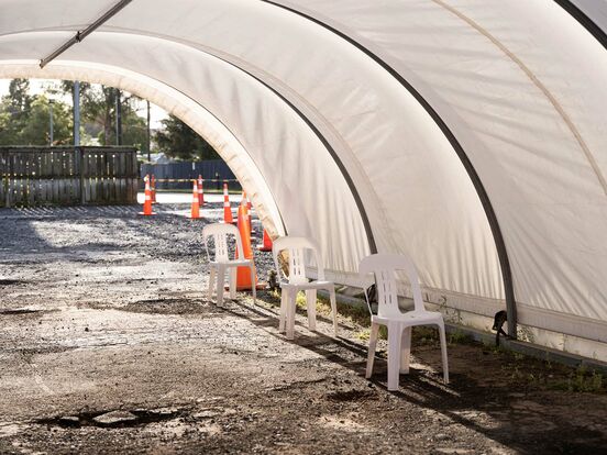 Carparks populated by tents and figures in PPE coveralls, city-rim blockades and ad-hoc medical centres are recent additions to our built environment. In late 2021, architectural photographer David Straight fixed his lens on these spaces with intent to document how our physical landscape reflects the time we’re living through.