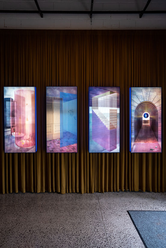 Raphaela Rose, The light that glistens so darkly- four toilets that stand or once existed across Tāmaki Makaurau, 2021. Installation view in Toro Whakaara: Responses to our built environment presented by Architectus. Photograph by Seb Charles.