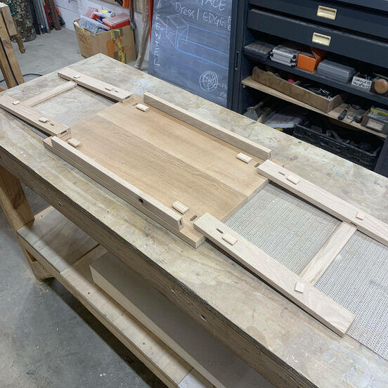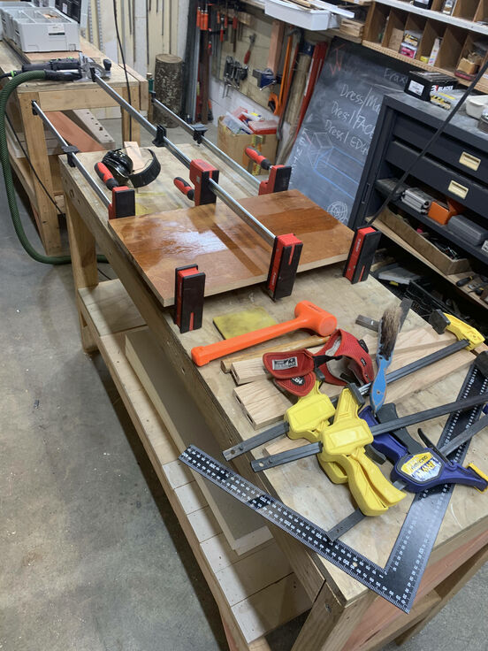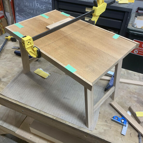 4. Do a dry run to make sure it all fits! Glue it and clamp it together, clean up any excess glue. I Thought I was being clever and used a Scotch-Brite pad to clean up…. Bad idea! It reacted with the tannins in the oak and it looked like it had caught a skin disease. Made for LOTS of extra sanding :(