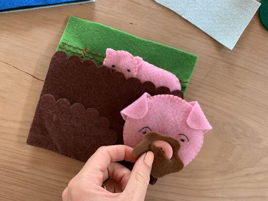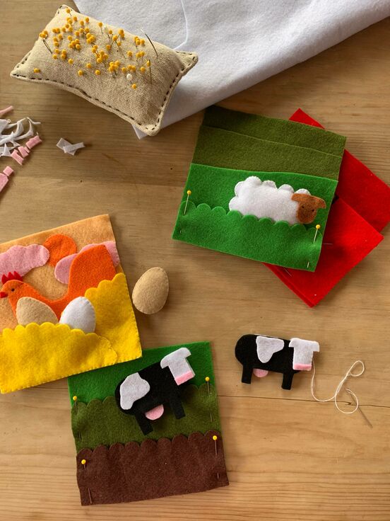 5. Use stitching, buttons and ribbons to add finishing details like woodgrain texture, eyes on animals or bunches of grass.